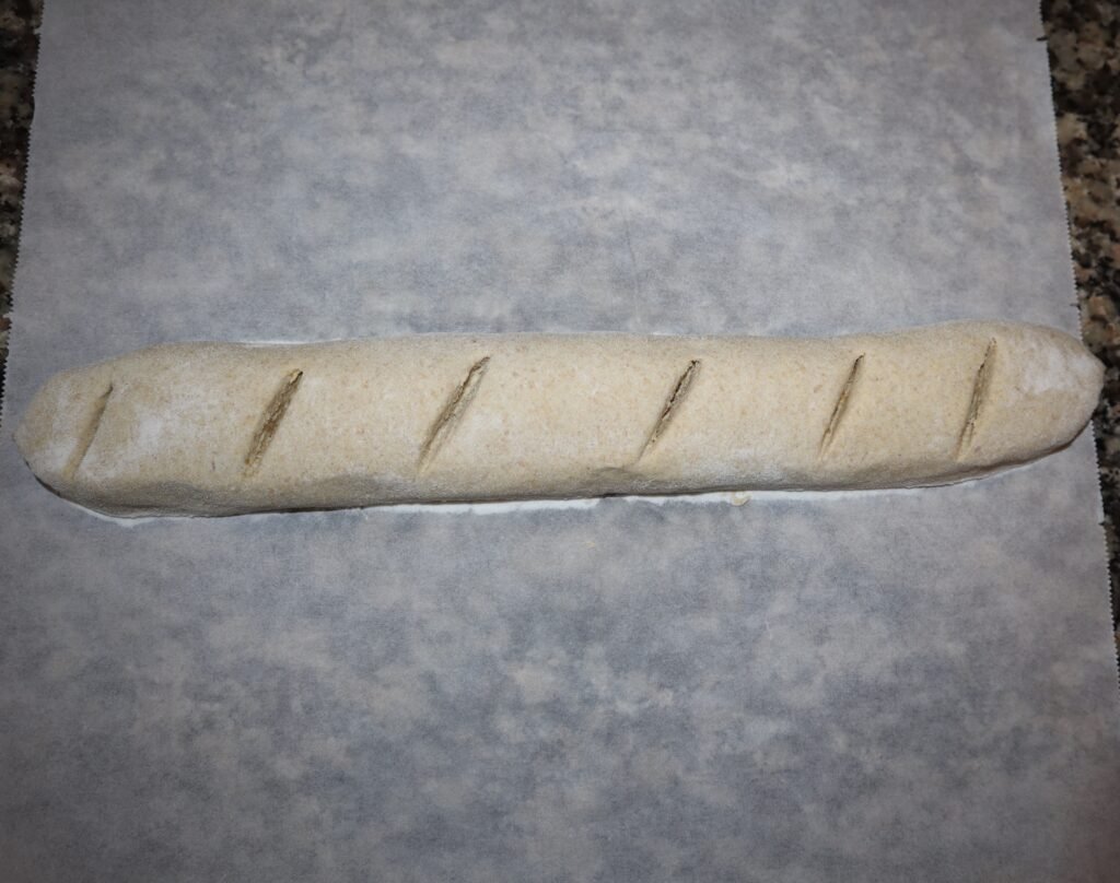 6. Quando estiver com formato de baguete, pode polvilhá-la com um pouco mais de farinha e fazer uns cortes com uma faca, para ficar com a aparência que pode observar na minha foto.