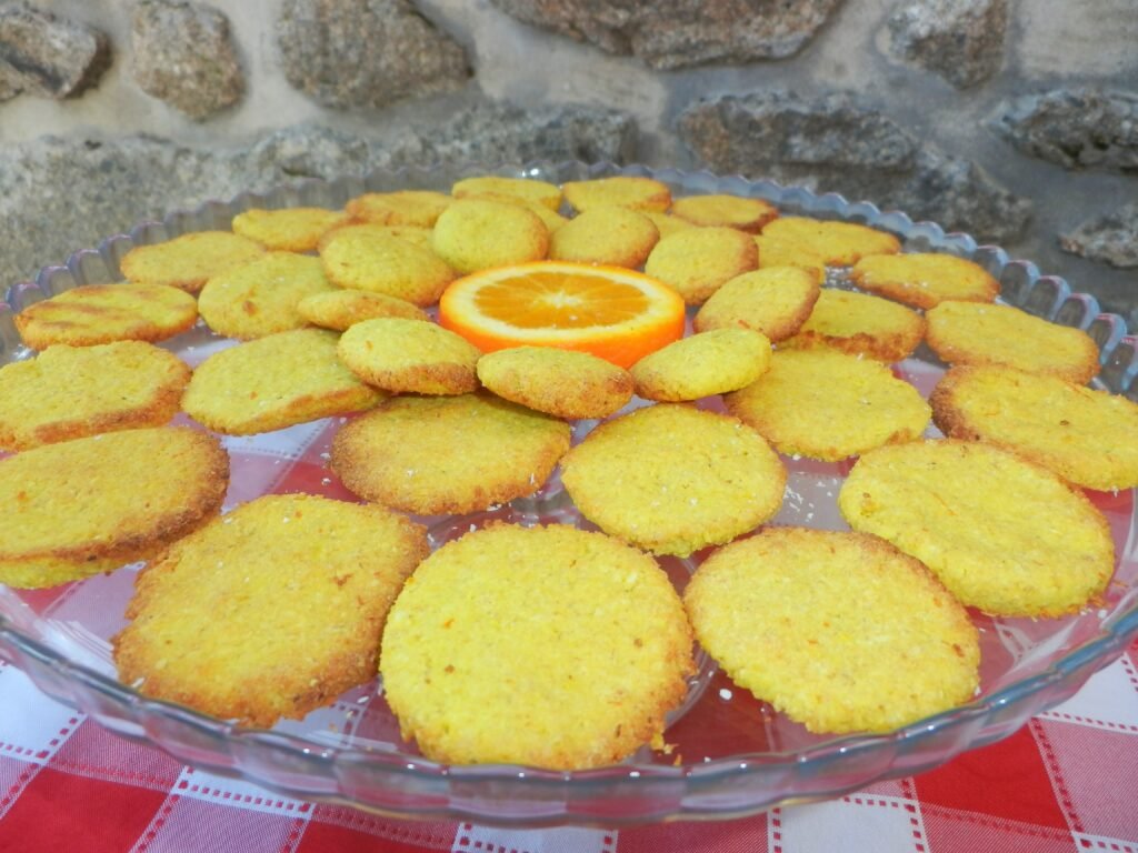 Esta receita é adaptada das minhas bolachas simples e crocantes que costumo fazer (as que usei na receita da Delícia de Manga ou Natas do Céu – como preferirem chamar). Só coloquei a laranja e aumentei a quantidade das farinhas para compensar.