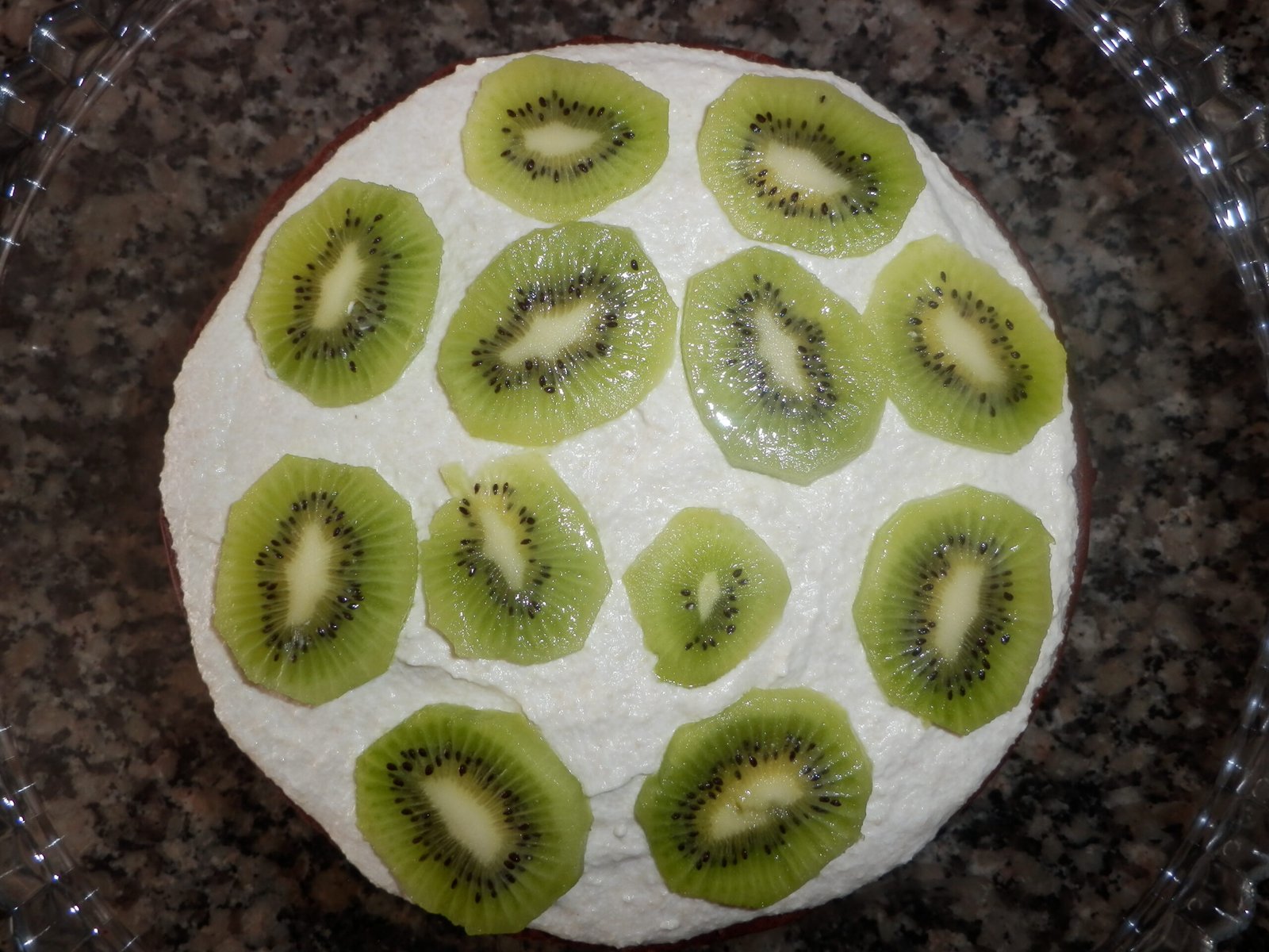 3. Rechear a primeira camada do bolo com parte do creme. Por cima, coloquei 2 kiwis fatiados.