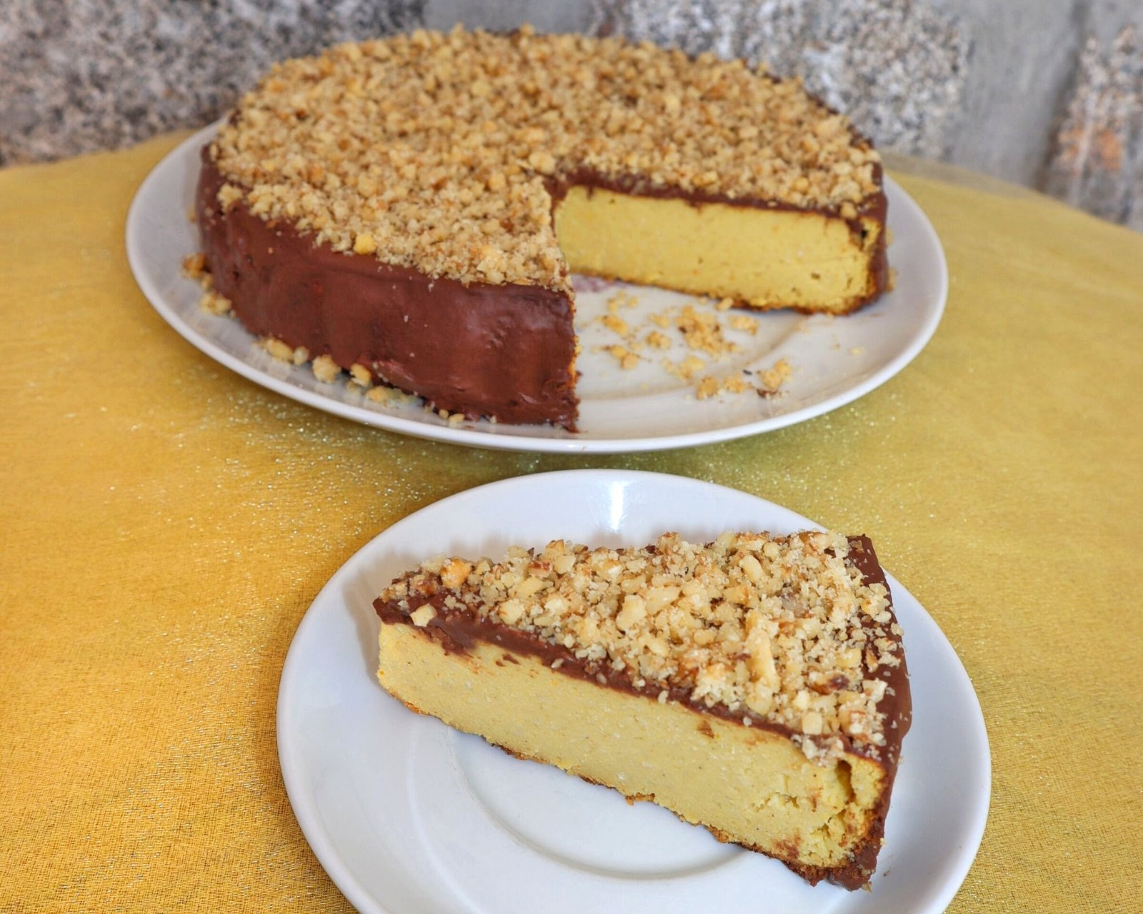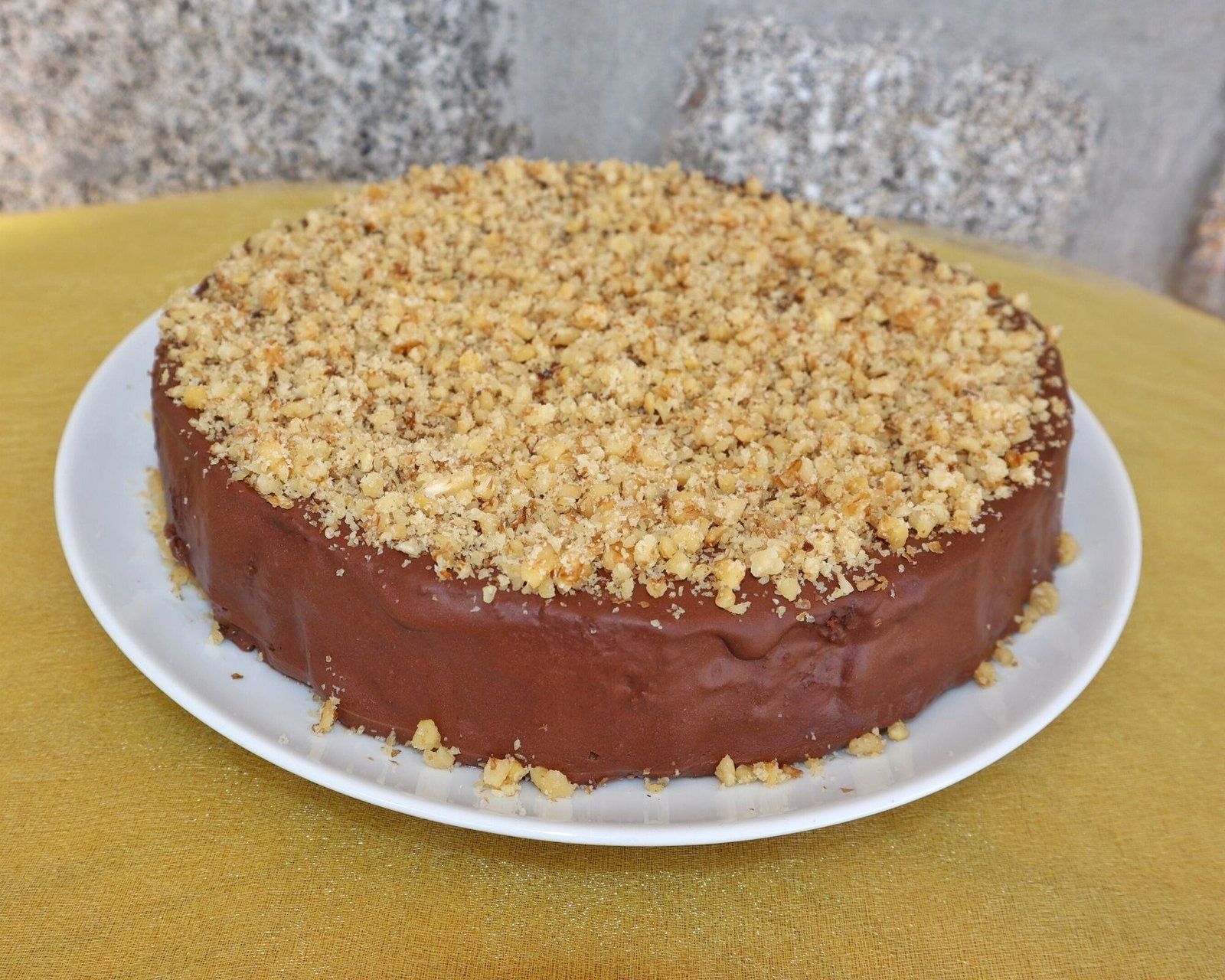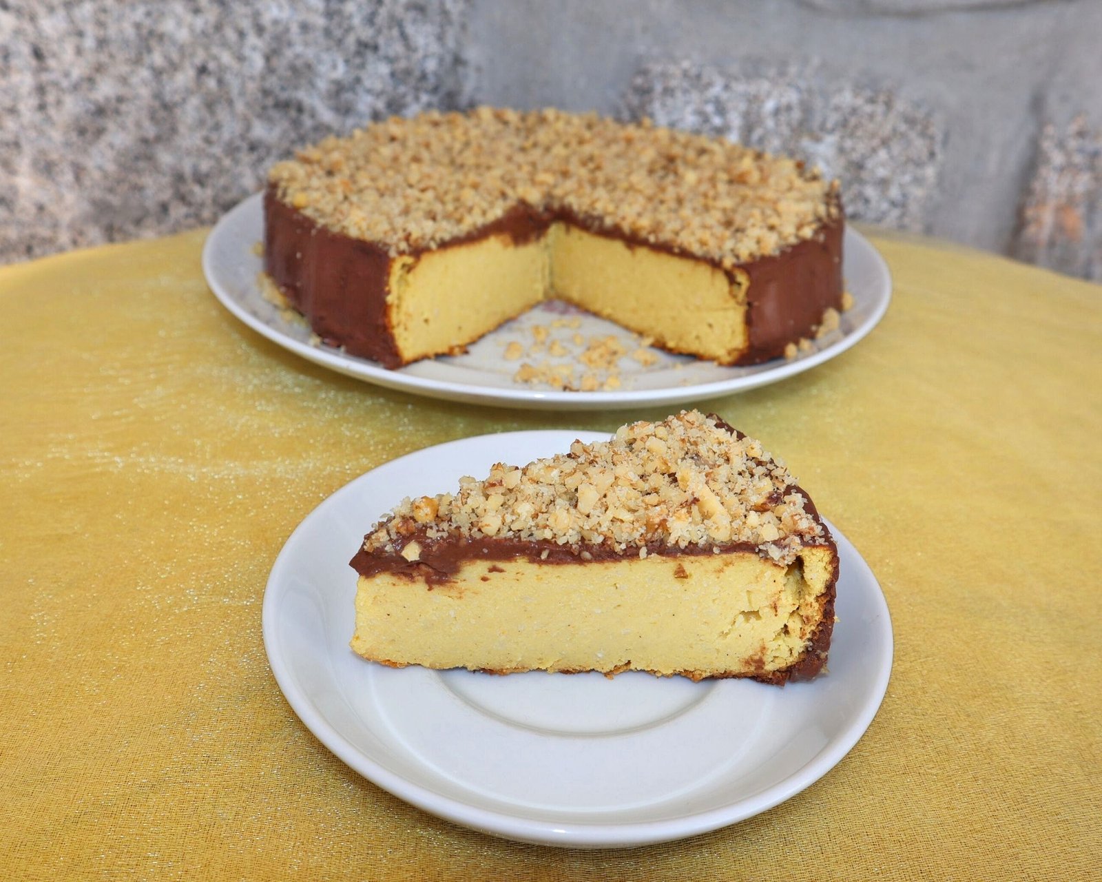 5. Unte com manteiga a base e as laterais de uma forma de fundo removível e coloque papel vegetal na base (a manteiga ajuda a fixar melhor).6. Verta o preparado na forma. Alise por cima com uma espátula e abane um pouco a forma para a mistura ficar bem nivelada.7. Leve ao forno pré-aquecido a 180ºC. Eu usei um forno elétrico e o meu ficou pronto em cerca de 45 minutos. Usei papel vegetal a meio do processo para não queimar na parte de cima.8. Deixe arrefecer e delicie-se assim OU pode fazer uma cobertura de chocolate negro.Opcional: Cobertura de Chocolate Negro