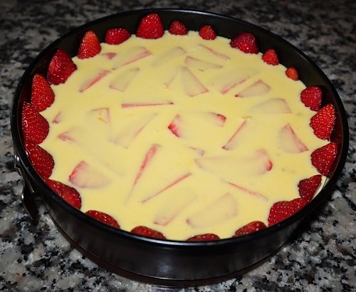 5. Retire do fogão e verta imediatamente por cima de uma das camadas do bolo (tem de estar dentro da forma!). Coloque também morangos cortados aos quartos no interior do recheio.