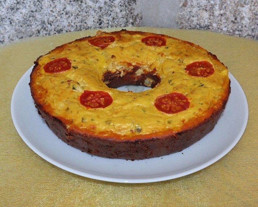 5. Verta o preparado na forma e decore a gosto, com azeitonas ou tomates.