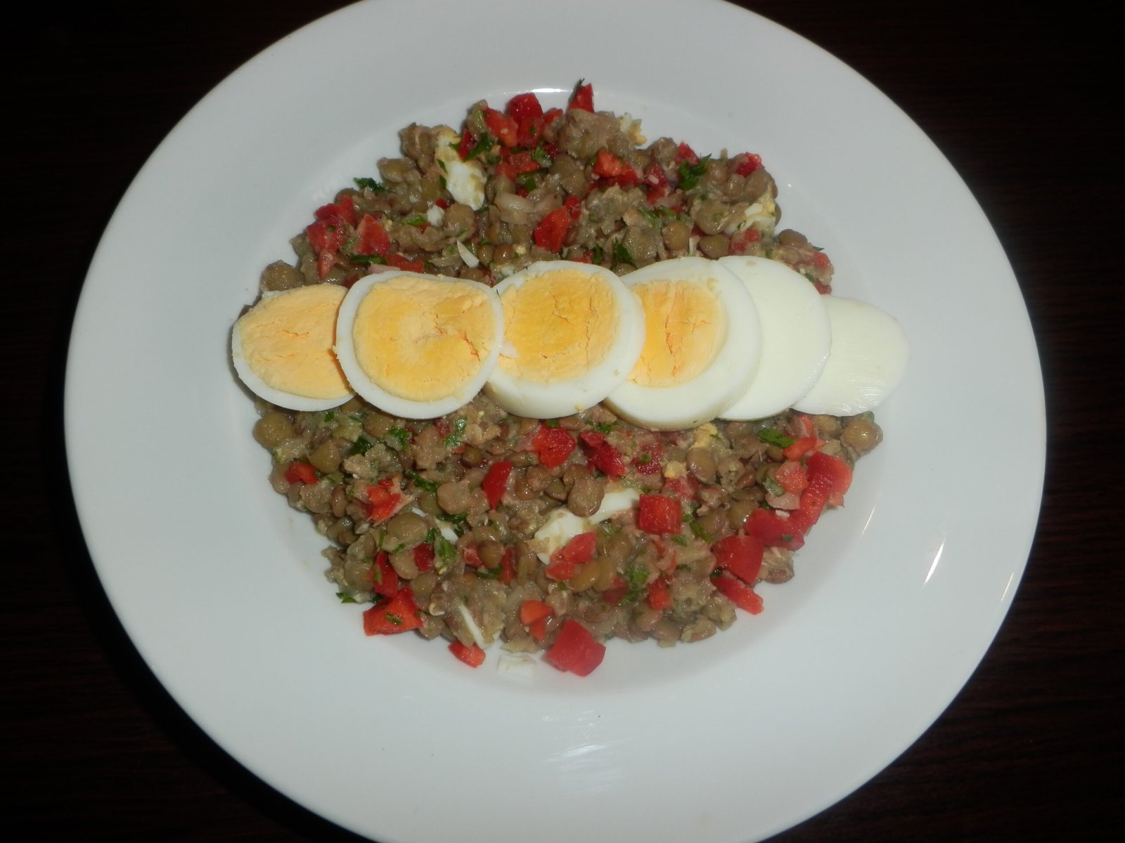 Salada de lentilhas: lentilhas*, pimento vermelho, cebola, salsa picada, atum, ovos cozidos + creme de legumes. Esta salada é uma maravilha 😀