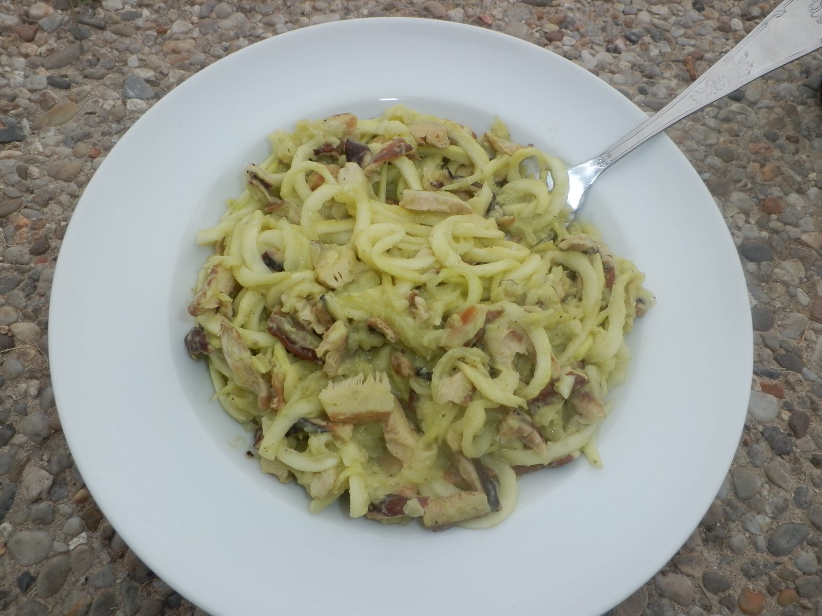 Noodles de Courgette com molho de abacate e cogumelos + panados de peru (usei farinha de mandioca).