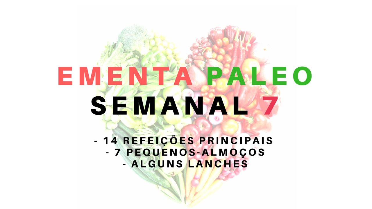 Partilho convosco mais um exemplo meu de uma ementa semanal Paleo (exemplo 7) – CORRENTE PRIMAL, com 14 almoços/jantares, 7 pequenos-almoços e várias sugestões de lanches. No final, dou algumas dicas para quem precisa perder peso.