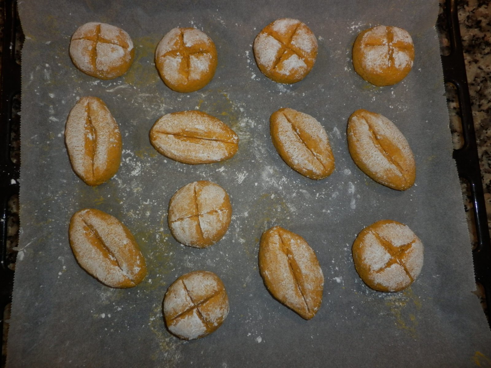 4. Se quiserem, podem colocar um pouco de polvilho doce à volta dos pães e usar uma faca para fazer o corte no meio.