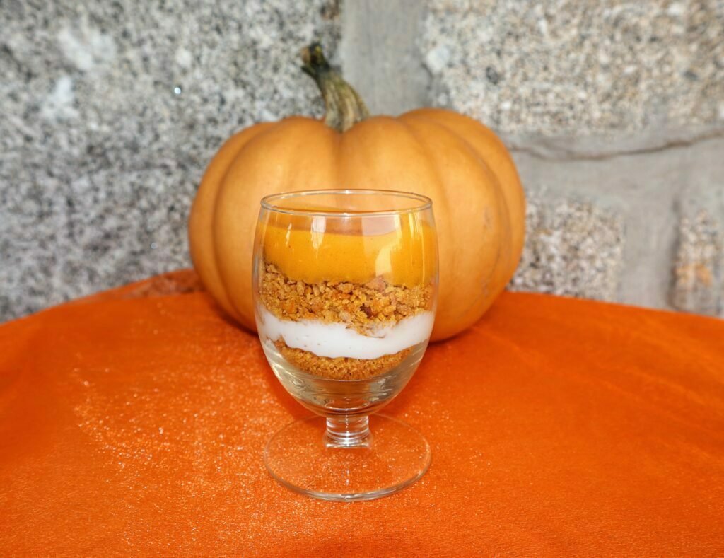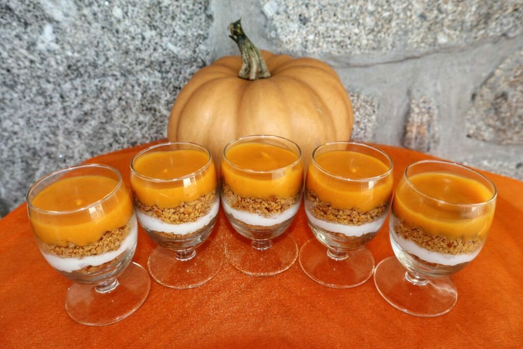4º – No topo, coloque o creme de abóbora, em cada tacinha.