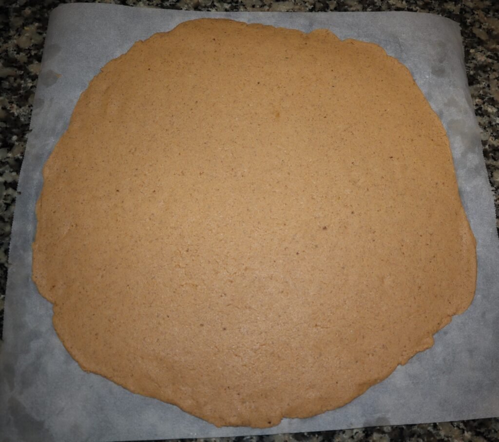 4. Assim que a mistura estiver uniforme, coloque-a por cima de papel vegetal e estique a massa, com a ajuda das suas mãos ou com um rolo (se necessário, unte-o com óleo de coco ou manteiga para facilitar o processo). É normal que a massa cole, mas não se preocupe, não tem de ficar perfeito (vai ser para triturar tudo no final).